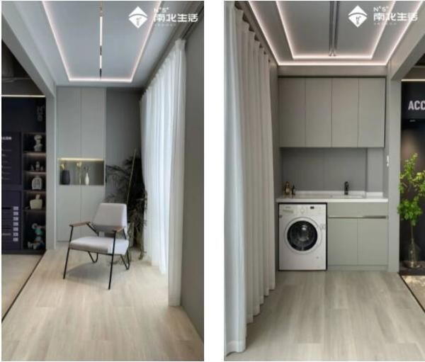 南北生活整装阳台2.0新品不仅仅是对1.0产品的简单升级而是彻底的颠覆,真正做到了顶、墙、地、柜全定制。为达到最佳的视觉效果,2.0产品针对细微的各种连接件也进行了创新,实现顶墙地柜同色并达到去金属化的效果。