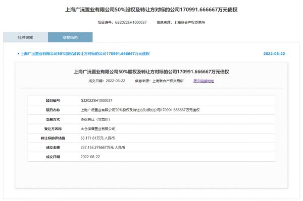 据上海联合产权交易所消息,近日,上海广沅置业有限公司50%股权及17.09亿元债权转让事项交易结束。该标的由太仓保耀置业有限公司摘得,成交金额23.71亿元。