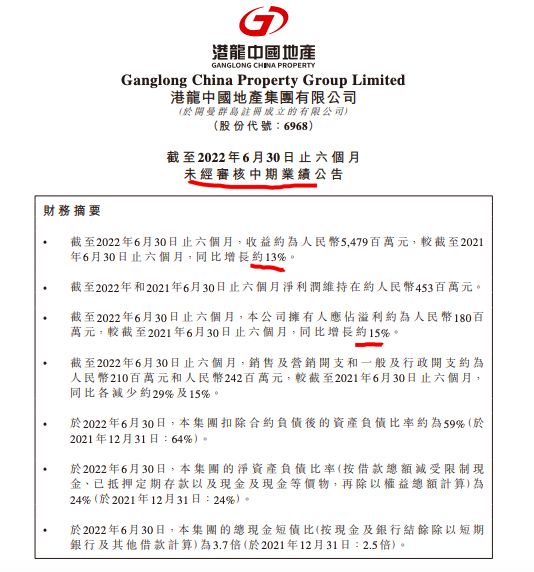 港龙中国地产上半年归母净利同比增长15% 毛利率下降2.82个百分点