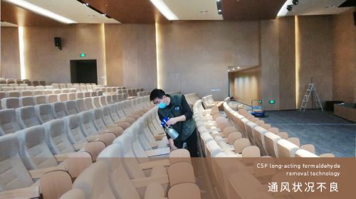 报告厅由于没有窗户导致通风状况不佳,通风状况较差基本是所有空气治理项目的痛点,无法进行有效的空气流通就意味着难以及时将室内的游离有害气体排出室外,同时空气流通缓慢也让喷涂产品的效果发挥变慢。