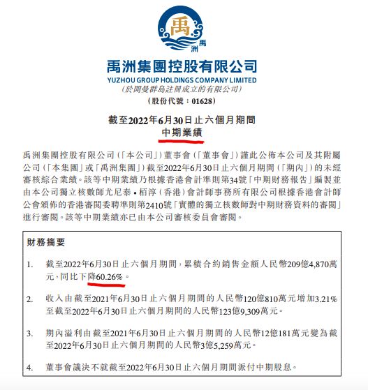 禹洲集团2022上半年归母净利下降93.1% 融资成本支出同比增长1倍