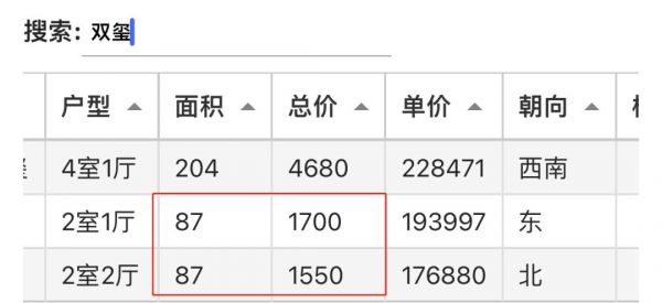 同样拿双玺来对比,双玺88平的小户型无论在成交价还是成交量上,相比较大户型来说都差很多。