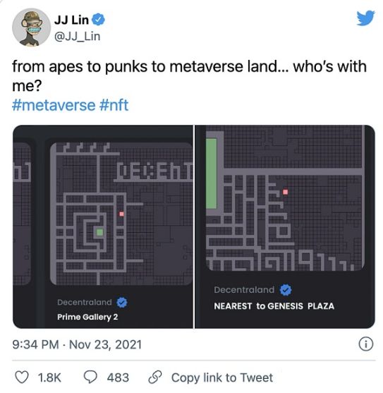 11月22日,林俊杰以25840.82美元的价格购得名为Prime Gallery 1的虚拟地块;
