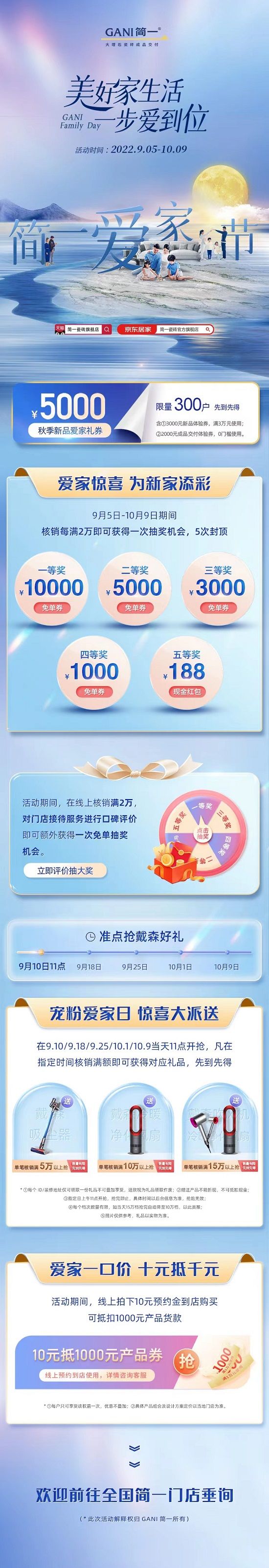 9月5日-10月9日,美好家生活·一步爱到位---简一爱家节正式启动,万元免单、大牌戴森礼品大派送、5千元爱家礼、爱家分享免费抽大奖、十元抵千元等爱家福利一次释放,助力美好家生活。