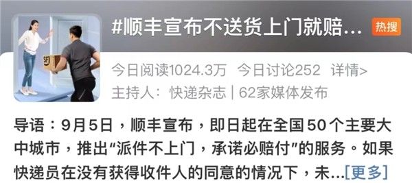 近日,顺丰集团官方微博宣布,自9月5日起,在全国50个主要大中城市同时亮出“派件不上门,承诺必赔付”的服务承诺。消息发布后,#顺丰宣布不送货上门就赔钱#这一话题,冲上了微博热搜。