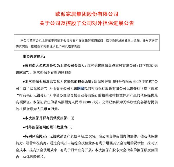 新浪家居定制频道讯9月8日,欧派家居发出公告称欧派家居及其控股子公司,为无锡欧派针对其向招商银行无锡分行申请的综合授信业务所产生的债务,提供8000万元的最高额担保,在股东大会批准的额度范围内,风险可控。
