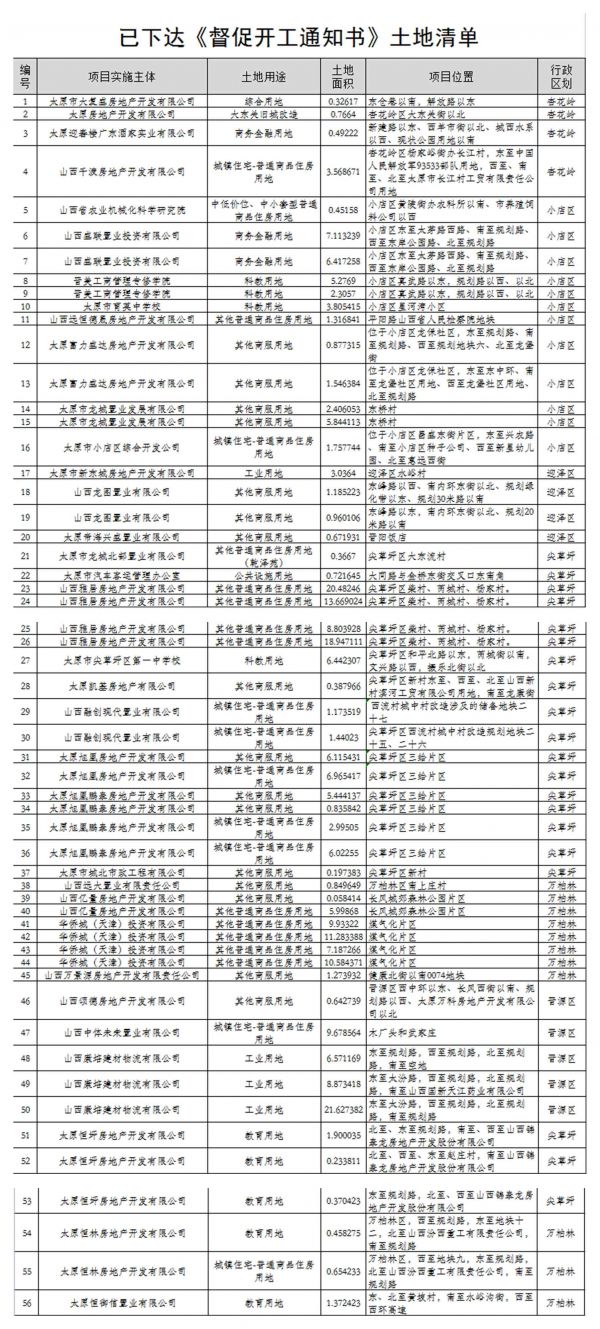 太原市规划和自然资源局称,依据相关法规规定,经该局调查核实,发现有部分土地未按合同约定进行开工建设。2022年6月份,太原市规划和自然资源局按照工作流程向太原恒御信置业有限公司等41家涉及未按期开工项目的企业签发了《督促开发通知书》,对其共计56宗未按期开工的土地进行了督促,要求其尽快开工建设。