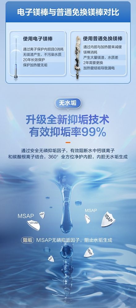 与普通镁棒不同,美的一直走在热水器研发前沿,持续技术迭代创新,全新推出“终身免清洗”电热水器产品——恒净电热水器TF7,搭载电子镁棒,其内芯采用99.5%航天级纯钛材料,表面采用贵金属铱坦涂层,高抗耐腐蚀,并且配备自主研发的AI智能芯片,能实时监测水质,同时升级全新抑垢技术,有效抑垢率达99%,全方位净护内胆,确保内胆在全水质工况下,达到完全防腐保护,做到无渣污垢终身免消耗,不仅解决了用户频繁更换镁棒的烦恼,提升水质健康,更引领行业迈入镁棒免清洗时代。
