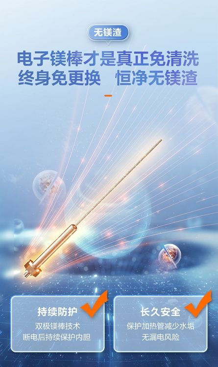 众所周知,电热水器通常采用镁棒进行防腐,然而,传统镁棒一般2年左右就需要更换一次,尤其是在部分水质较差的地区镁棒表面容易钝化,被大量镁渣污水包裹无法保护内胆导致漏水,不仅污染水质,影响人们的健康沐浴生活,还容易引发安全隐患。