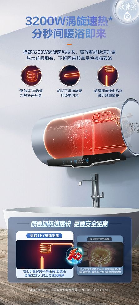 美的恒净电热水器TF7搭载3200W涡旋速热技术,采用“聚能环”加热管,高效聚能快速升温,并且超长下沉加热管,加热更均匀,让用户下班回来即可快速畅享净肤暖浴。