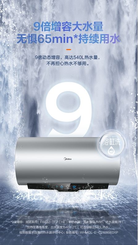 为了满足用户用水需求,美的恒净电热水器TF7采用9倍动态增容,带来高达390L热时量,可满足多人口大家庭或者用户长时间用水需求,让用户无需担心热水不够用的困扰。