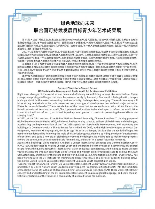 “绿色地球向未来-联合国可持续发展目标青少年艺术成果展”由联合国训练研究所联合青少年领航计划策划,吸引了参与该能力建设活动的中国大陆与香港青少年。