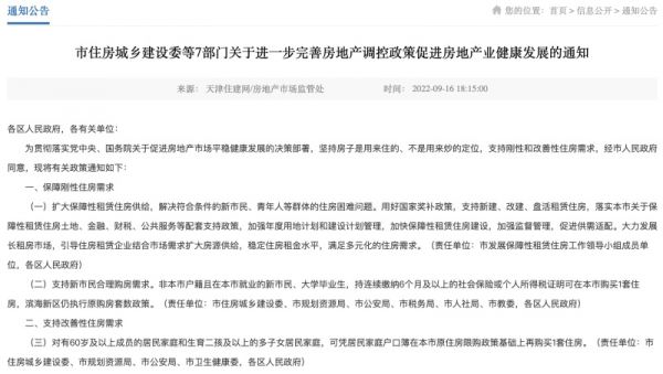 9月16日,天津市住房城乡建设委、市规划资源局等7部门联合发布《关于进一步完善房地产调控政策促进房地产业健康发展的通知》,从保障刚性住房需求、支持改善性住房需求、完善住房信贷政策、促进房地产业健康发展4个方面推出12项具体举措。