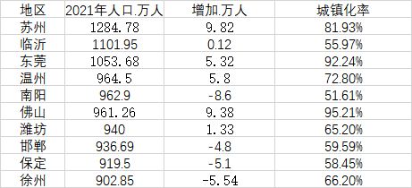 根据第一财经记者统计,2021年我国人口最多的十大地级市分别是苏州、临沂、东莞、温州、南阳、佛山、潍坊、邯郸、保定和徐州,这10个城市常住人口均超过900万人。