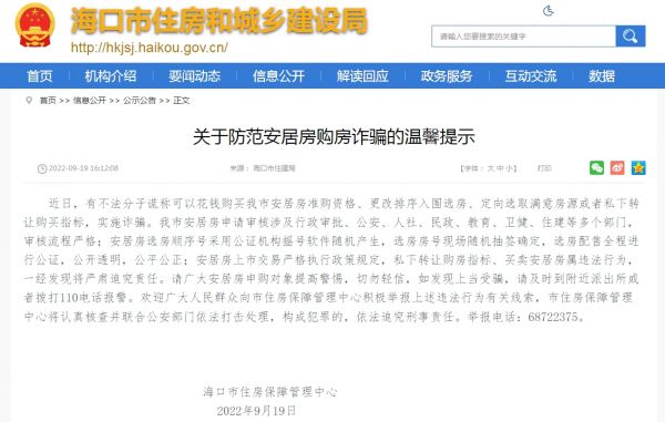 中新经纬9月19日电 据海口市住建局网站消息,海口市住房保障管理中心19日发布关于防范安居房购房诈骗的温馨提示称,近日,有不法分子谎称可以花钱购买海口市安居房准购资格、更改排序入围选房、定向选取满意房源或者私下转让购买指标,实施诈骗。