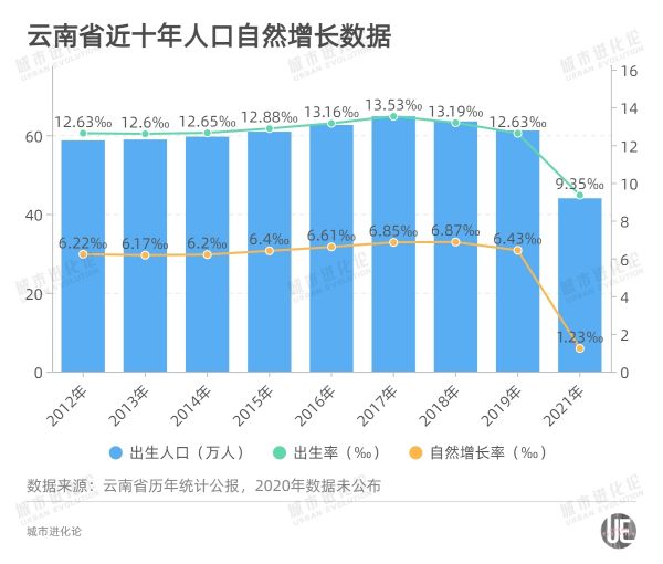 与此同时,云南省2021年的出生人口、出生率和自然增长率均创下新低,成为过去十年的最低值。