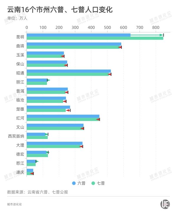 从六普到七普,云南仅昆明、西双版纳、德宏、怒江4个市州总人口占全省比重有所提升,也就是跑赢了全省的人口增势。