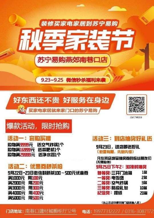 9月23日至9月25日,苏宁易购南巷口店“9月店庆福利秒杀”活动正式启动。