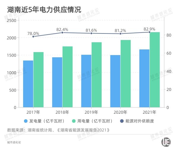 “缺煤、无油、乏气,水资源开发殆尽,新能源开发潜力有限。”在降碳和能源保供双重压力下,湖南能源对外依存度居高不下,保供形势十分严峻。湖南省能源规划研究中心发布的《湖南省能源发展报告2021》显示,2021年湖南全省用电需求大增,最大负荷连续3次刷新历史纪录,实际用电需求突破3700万千瓦,供电能力已达极限。