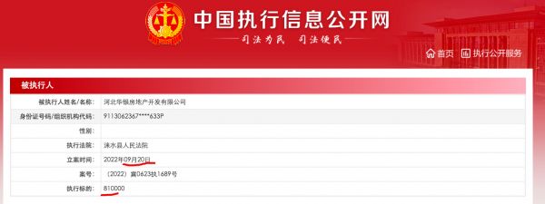 中华网财经9月22日讯:据中国执行信息公开网消息,河北华银房地产开发有限公司被法院列入被执行人。具体案号为(2022)冀0623执1689号,执行标的为810000元,执行法院为河北省保定市涞水县人民法院。