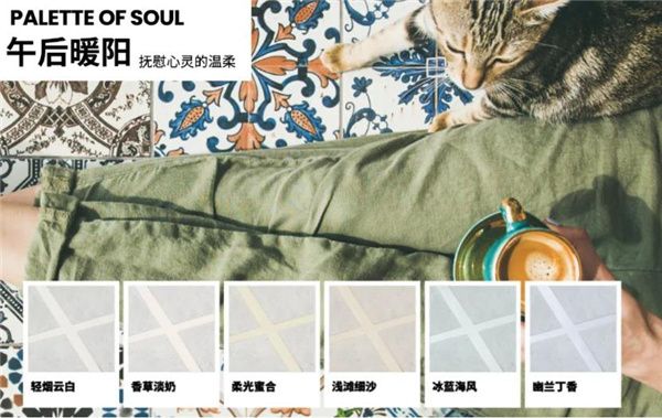 德高美缝午后暖阳新色盘,涵盖轻烟云白、香草淡奶、柔光蜜合、浅滩细沙、冰蓝海风、幽兰丁香六款颜色,以低彩度、高明度的温柔色调,演绎午后阳光的明媚。