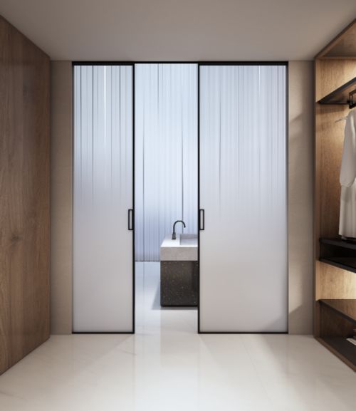 围绕“自我”所展开的卫生间布置,与衣帽间连接起来,打造精致利落、纯粹自我的的理想卫生间。选择德立全景门(玻璃隔断门),隐藏式设计将门“收”进墙内。朦胧柔和玻璃带来通透唯美的视觉体验。