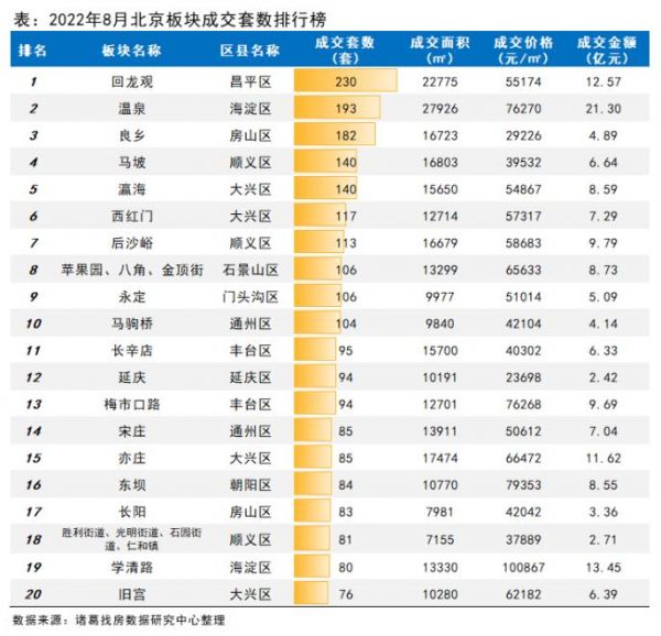 8月北京TOP10板块成交超百套 昌平回龙观板块再夺首位