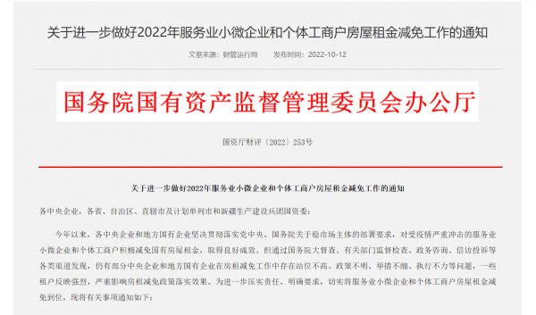 2022年10月12日,国务院国资委发布《关于进一步做好2022年服务业小微企业和个体工商户房屋租金减免工作的通知》(以下简称《通知》),就切实将服务业小微企业和个体工商户房屋租金减免到位做出详细安排。