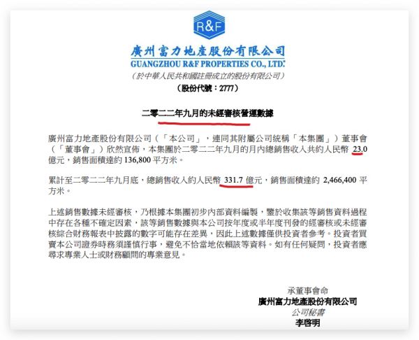 另,截至2022年9月底,富力地产总销售收入约人民币331.7亿元,同比减少64.41%,销售面积达约2,466,400平方米。