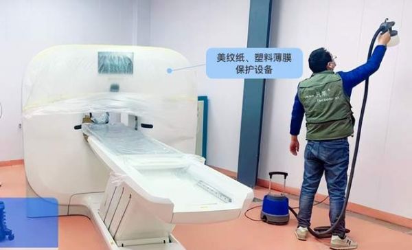 我们所服务的所有医疗机构中对于医疗设备的保护问题都是整个治理项目中的头等大事,我们必须慎而又慎。医疗设备不仅造价高而且不方便移动,再加上医疗机器基本上是金属产品本身不含有多少有害气体,因此我们在治理时不需要进行处理,只需要对其进行合理的保护即可。下图可以看到我们使用了美纹纸、塑料薄膜将设备进行的保护起来,注意一定要严密包裹,不留一点缝隙,避免贵重物品受到损伤。