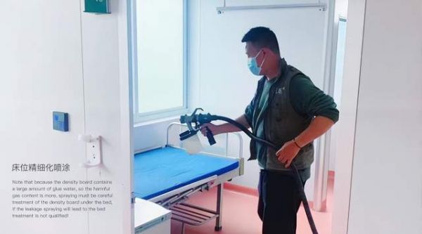 医院部分房间是用隔断隔开的,而隔断的材质如果使用的是实木复合板的话就需要加强处理,因此选择芬多精+无光触媒+光触媒进行综合治理。先喷涂芬多精,喷涂用量为30-40ml/㎡;5分钟后喷涂无光触媒,喷涂用量为50-60ml/㎡;最后喷涂纳米光触媒,喷涂用量为10-20ml/㎡