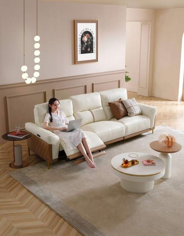 50825功能沙发整体呈奶油暖色系,十分精致。这款沙发采用甄选优质牛皮,根据身形、坐落位置特别设计出升高靠包和回弹充实的海绵,使沙发的包裹性和支撑性非常好,躺在上面颈椎、腰椎无压力,更健康。功能位置可实现110°-160°电动调控,休闲时刻自定义舒适角度,躺上面玩手机、观影或者睡觉,都十分惬意。