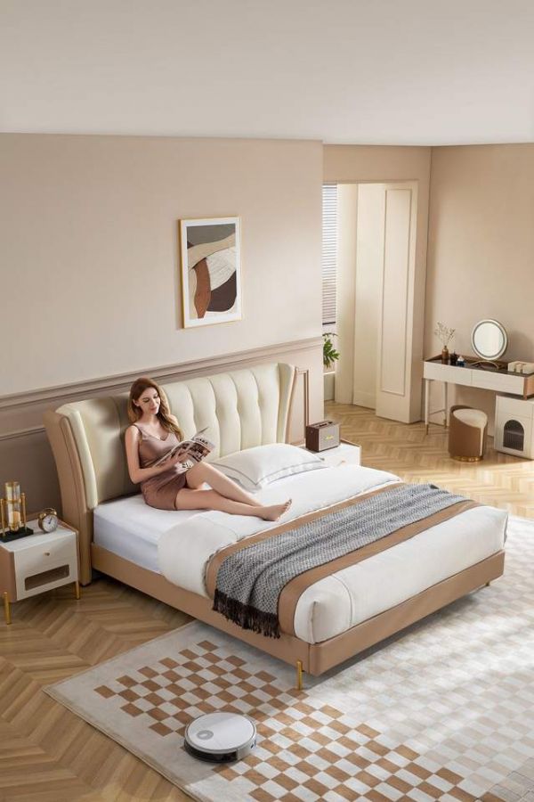 床的选择则直接影响到睡眠质量,芝华仕C224真皮床,采用进口头层黄牛皮,质感细腻。流星大床屏设计,尽显大气。靠包是基于人体脊椎生理曲度,能有效地分散背部压力,靠感十分舒适。这款床有两种规格可选,高脚款和储物款,高脚款使整个卧室空间更通风透气,储物款则能完美提高空间储物能力,可通过APP操控的电动升降,储物、换床单、清扫都不费力,十分方便。