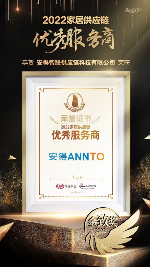近日,由乐居家居主办,新浪家居承办,家页、家居质量研究院联合主办;全国工商联家具装饰业商会、中国建筑材料流通协会共同指导支持的家居行业金致奖评选活动正式落下帷幕。“金致奖”旨在基于国家政策、市场趋势对家居行业年度优秀人物、优质品牌及产品服务树立行业标杆,鼓励家居产业链上的企业以技术创新及品牌升级为原动力,不断提升品牌力、产品力、经营力,鼓励家居人不断发扬专业及匠心精神,推动行业健康、可持续的高速发展。凭借在供应链领域的家居解决方案,安得智联荣获金致奖-2022家居供应链优秀服务商。