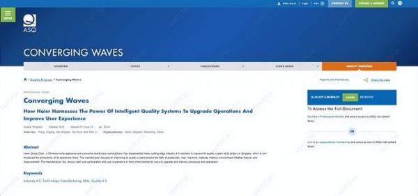 美国质量学会是领先的权威质量机构,在全球拥有超过10万名个人和企业会员,为质量专业人士、从业人员以及日常消费者提供技术、思想、工具以及培训。《Quality Progress》是由美国质量学会ASQ于1946年创办、出版的质量领域权威期刊。这一期刊一直站在质量运动的最前沿,ASQ自 2002年进入中国以来,作为国际最权威的质量学术管理和交流机构,开展了积极而卓有成效的工作。该期刊对上刊论文有非常高的选拔要求,此番被行业权威杂志认可,是以青岛海尔洗衣机互联工厂为代表的海尔智能制造向世界展示其实力和能力的最佳机会。