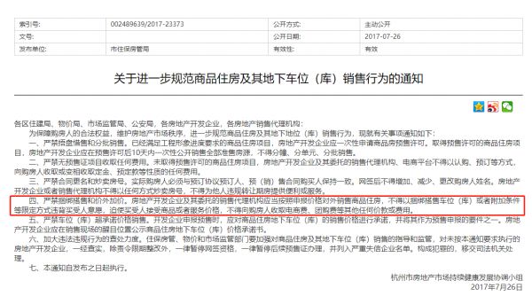 2016年下半年,杭州楼市开启火爆行情,出现了天价车位和强制捆绑车位销售的乱象。2017年7月,杭州出台了《关于进一步规范商品住房及其地下车位(库)销售行为的通知》,明确了包括捆绑销售车位在内的房地产市场五类违规行为,并进行严厉打击,明确了地下车位(库)销售实行价格承诺制。至此,杭州车位漫天要价的乱象被终结。
