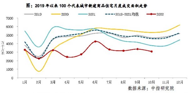 依靠销售回笼资金仍然是大多数房企的选择,不过现状并不乐观。据中指研究院统计,今年前10月,重点100城新建商品住宅月均成交面积约3109万平方米,同比下降超30%。其中,9月百城商品住宅成交面积环比增长6.1%,同比下降19.1%;10月受多地疫情反复等因素影响,百城成交面积环比下降约10%,同比降幅仍在两成左右。