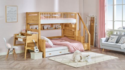 .上下床就是属于一种百变造型,各种各样,还可满足不同户型需求,就算是一个孩子也能满足他们睡上床梦,不仅满足睡上床梦,还给孩子们腾出了储物空间和娱乐空间,当然学习空间也不能少,相当于一床解决孩子需要的一切!