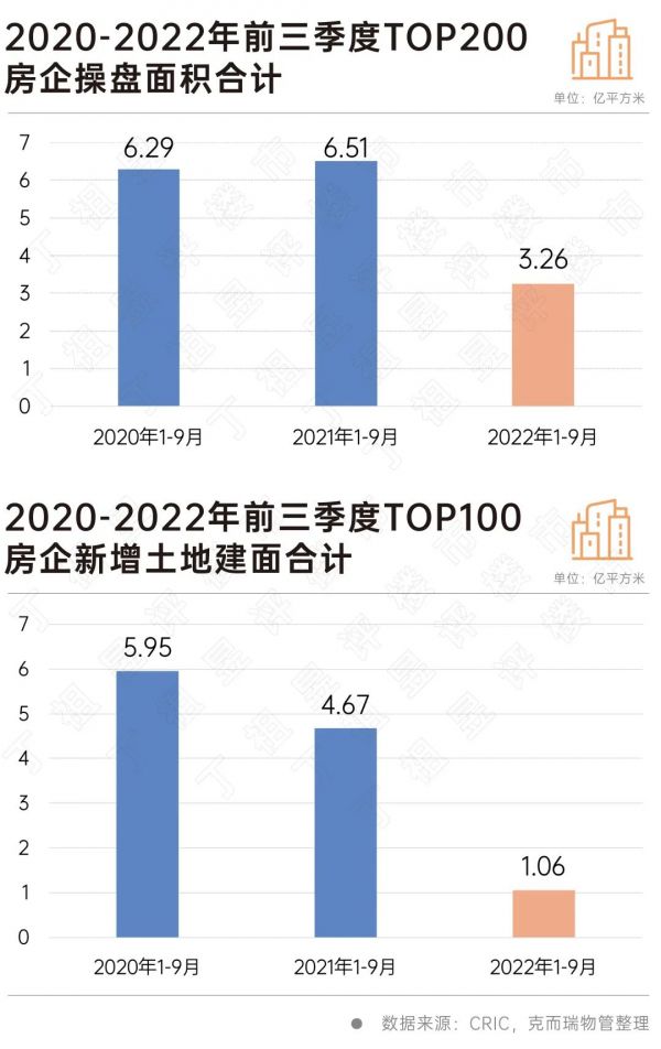 地产向物企出售资产 地产关联方应付账款欠款 抵押股权或出售物业公司 随着地产供货放缓,市场对物业企业的发展也产生了隐忧。 2022年前三季度,TOP200房企操盘面积为3.26亿平方米,同比下降49.9%。这意味着,一至两年后地产公司可交付的新房管理面积可能打五折。2022年前三季度,TOP100房企新增土地建面为1.06亿平方米,同比下降77.3%。土地建面大幅下滑,新增可交付住宅面积也将大幅下降。两至三年后,物业公司可从地产母公司获取的新增在管面积将大幅减少。