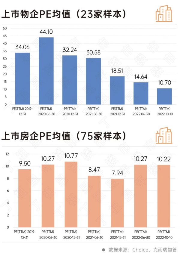 不仅如此,整个物业板块估值也遭受腰折,上市物企PE值在2020年中达到高点后一路下行,截至2022年10月10日,上市物企PE均值为10.70,目前和房企PE(10.22)估值接近。