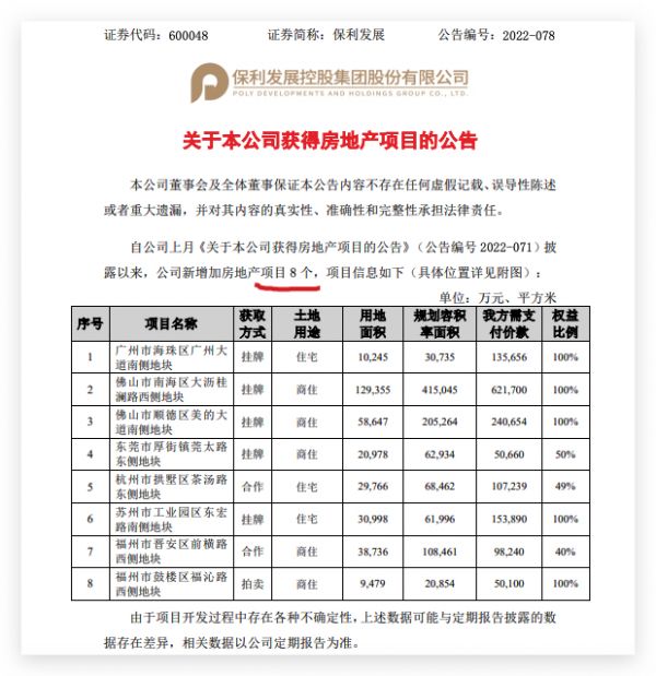 值得注意的是,在新获项目权益最低为40%,为福州市晋安区前横路西侧地块。地块面积最大及单价最高的为佛山市南海区大沥桂澜路西侧地块,为保利发展通过挂牌方式获取,用地面积约12.93万平,规划容积率面积41.50万平,需支付价款62.17亿元。