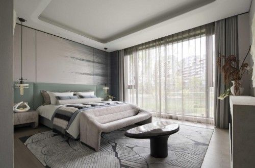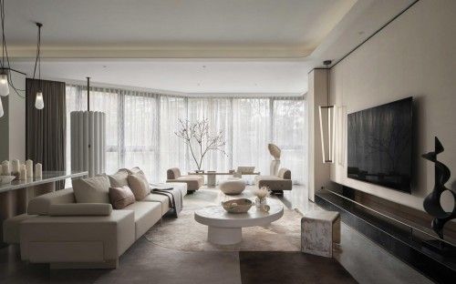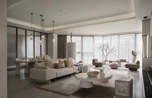 三面环水,一面公园,中庭景观的生态优势,将居所置于自然之间,而回应这一对话最贴切的设计语言,便是化繁为简,从空间格局到色彩关系,到各空间的尺度和艺术运用,减少设计的痕迹,用最适合的展现手法,为空间和自然的融合增色。