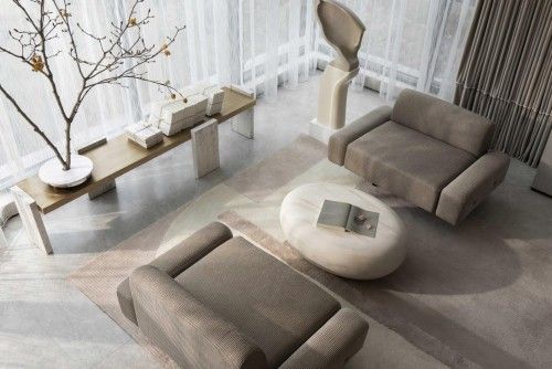 也许是受远古基因记忆的影响,我们身体的感官对于自然有着天然的向往,WSD的设计师对自然元素进行拆分重构,将”湖水“、“叠嶂”、”山野丛林“、融于空间,叠加轻柔的材质和优雅的线条律动,是淡然的,也是浪漫的。