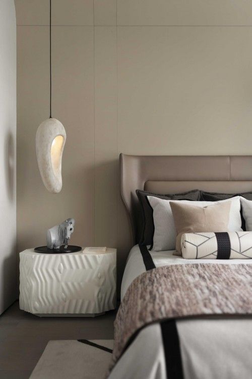 米色系和棕色系的交织为空间增添了一份故事感,随着夜幕降临,晚风吹进来合上了案台上的书,灯火渐暗,一切归于平淡,生活的从容与美好常常源于这些细微的感受。