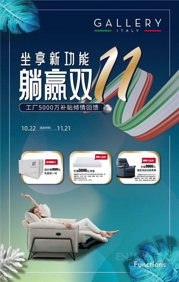 10月22日-11月21日,欢迎莅临GALLERY全国门店,参与“坐享新功能,躺赢双11”活动,工厂5000万补贴倾情回馈,优惠购买爆款布艺沙发GA-A0536《天鹅湖》、舒适功能沙发GA-12477《维多利亚》、GA-12590-CN-Y《圣天使堡》及客餐厅卧空间整体优惠选购方案,更有满额送乳胶枕、满额换购床垫、真皮电动功能单椅等多重优惠豪礼。更多优惠活动,欢迎莅临门店选购体验。