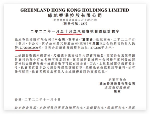 中华网财经11月11日讯:绿地香港(0337.HK)发布2022年一月至十月之未经审核营运统计数字显示,2022年前10个月,公司、其子公司及其联属公司的合约销售约为人民币127.96亿元,同比下跌56.29%,已售合约总建筑面积则约为1,270,846平方米。