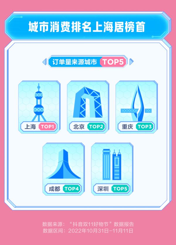 品质国货越来越受到消费者的青睐。在抖音商城双11热卖商品榜前100中,国产商品的占比超过90%。双11在丰富消费供给的同时,也为全国消费市场增添了活力。报告显示,抖音电商消费城市排行中,上海位列第一,北京、重庆、成都和深圳紧随其后。