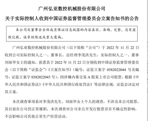 定制快讯|弘亚数控两位实控人涉嫌内幕交易双双被立案