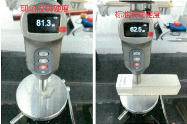 现场胶块颜色更深且硬度值远高于标准胶块(标准胶块干固后的硬度值大约为60—70),这基本可判断其掺入了水泥或砂混合使用。