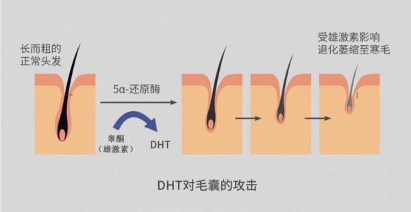 对头发威胁更大的是睾酮的代谢物,5α-二氢睾酮,它比睾酮的作用更强,能和毛囊受体结合,抑制毛发的生长,还会加速毛囊的萎缩坏死,让头发提前进入休止期。